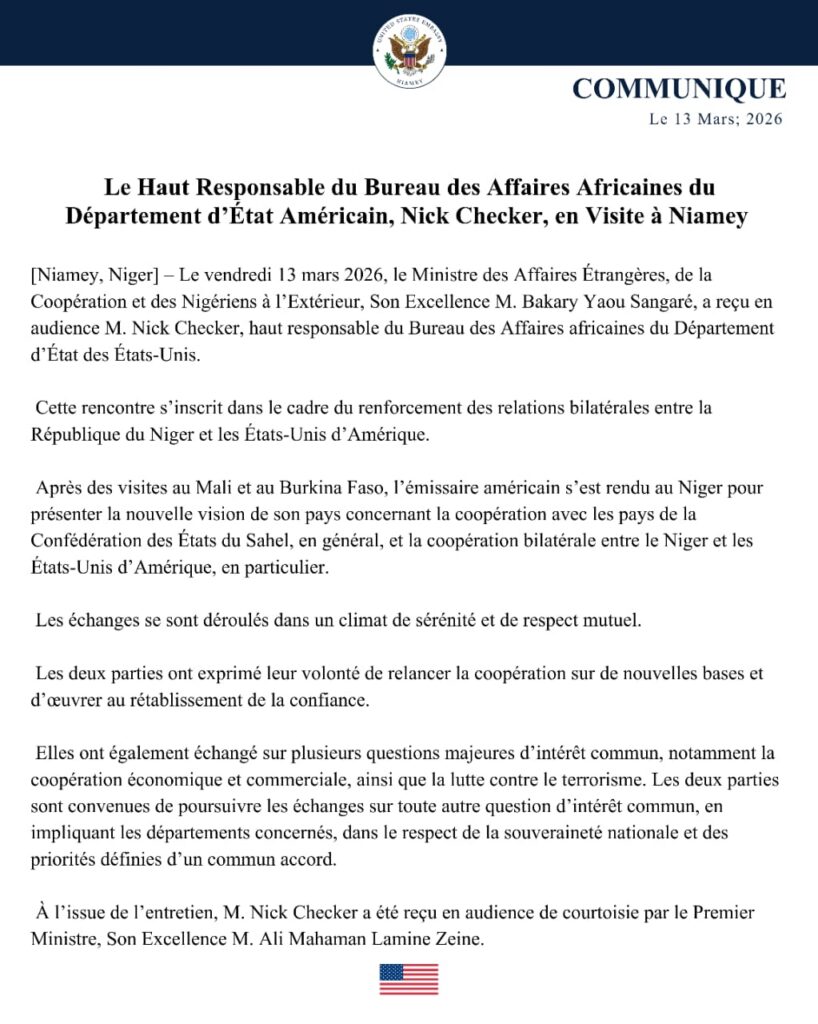 La visite à Niamey, le 13 mars 2026, du haut responsable du Bureau des Affaires africaines du Département d’État américain, Nick Checker, marque un moment charnière dans les relations entre le Niger et les États-Unis. Après plusieurs mois de refroidissement diplomatique dans un Sahel en pleine recomposition géopolitique, cette mission apparaît comme une tentative de réengagement stratégique, mais sous conditions.