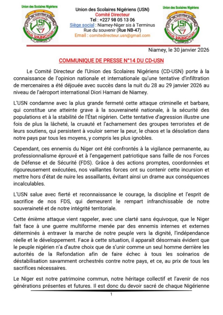 Niamey a été, une fois de plus, la cible d’une tentative d’agression aux lourdes implications sécuritaires. Dans un communiqué de presse publié le 30 janvier 2026, le Comité Directeur de l’Union des Scolaires Nigériens (USN) a annoncé qu’une tentative d’infiltration de mercenaires a été déjouée avec succès dans la nuit du 28 au 29 janvier 2026 aux abords de l’aéroport international Diori Hamani de Niamey.